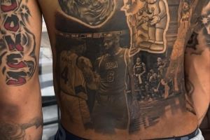 体育资讯7月22日讯 据美媒Courtside Buzz报道,南苏丹后卫卡里克-琼斯把奥运会上同詹姆斯交手时的合影纹在了后背上。